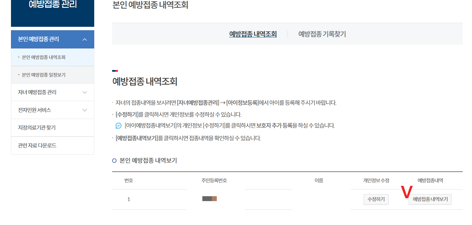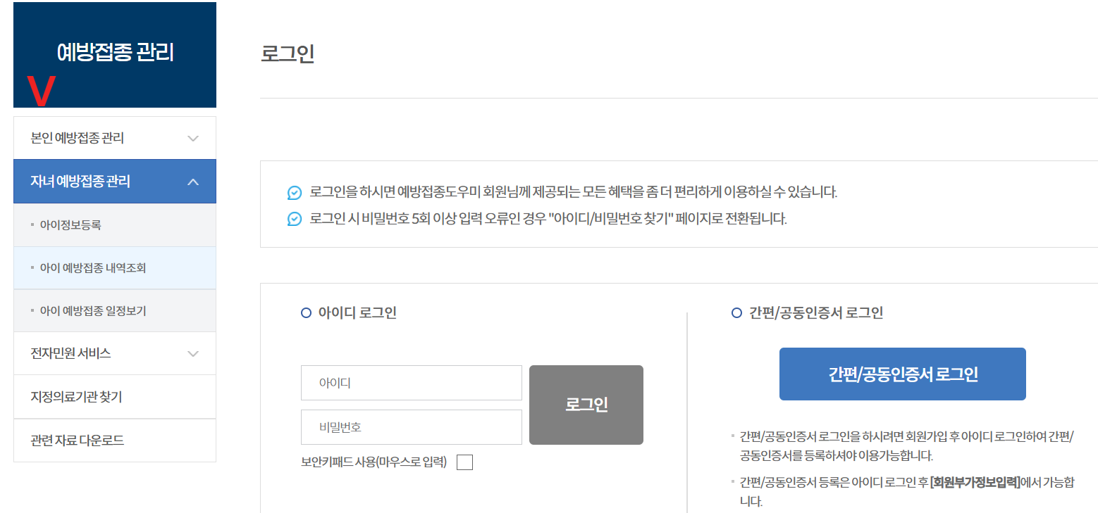2. 예방접종 확인: '내 예방접종 확인' 메뉴에서 본인과 자녀의 예방접종 이력 조회