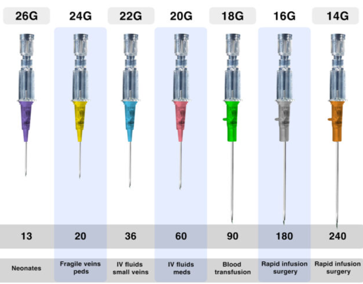 - 게이지(G)가 클수록 카테터의 직경이 작아져서 작은 정맥에 삽입하기 용이하고, 정맥 손상을 최소화함.